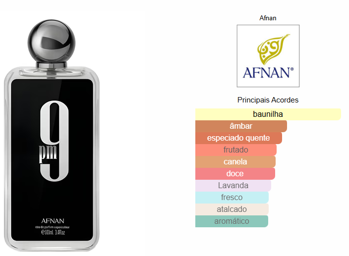 9pm de Afnan é um perfume Âmbar Baunilha Masculino. 9pm foi lançada em 2020. As notas de topo são: Maçã, Canela, Lavanda Silvestre e Bergamota. As notas de coração são: Flor de Laranjeira e Lírio-do-Vale. As notas de fundo são: Baunilha, Fava Tonka, Âmbar e Patchouli.